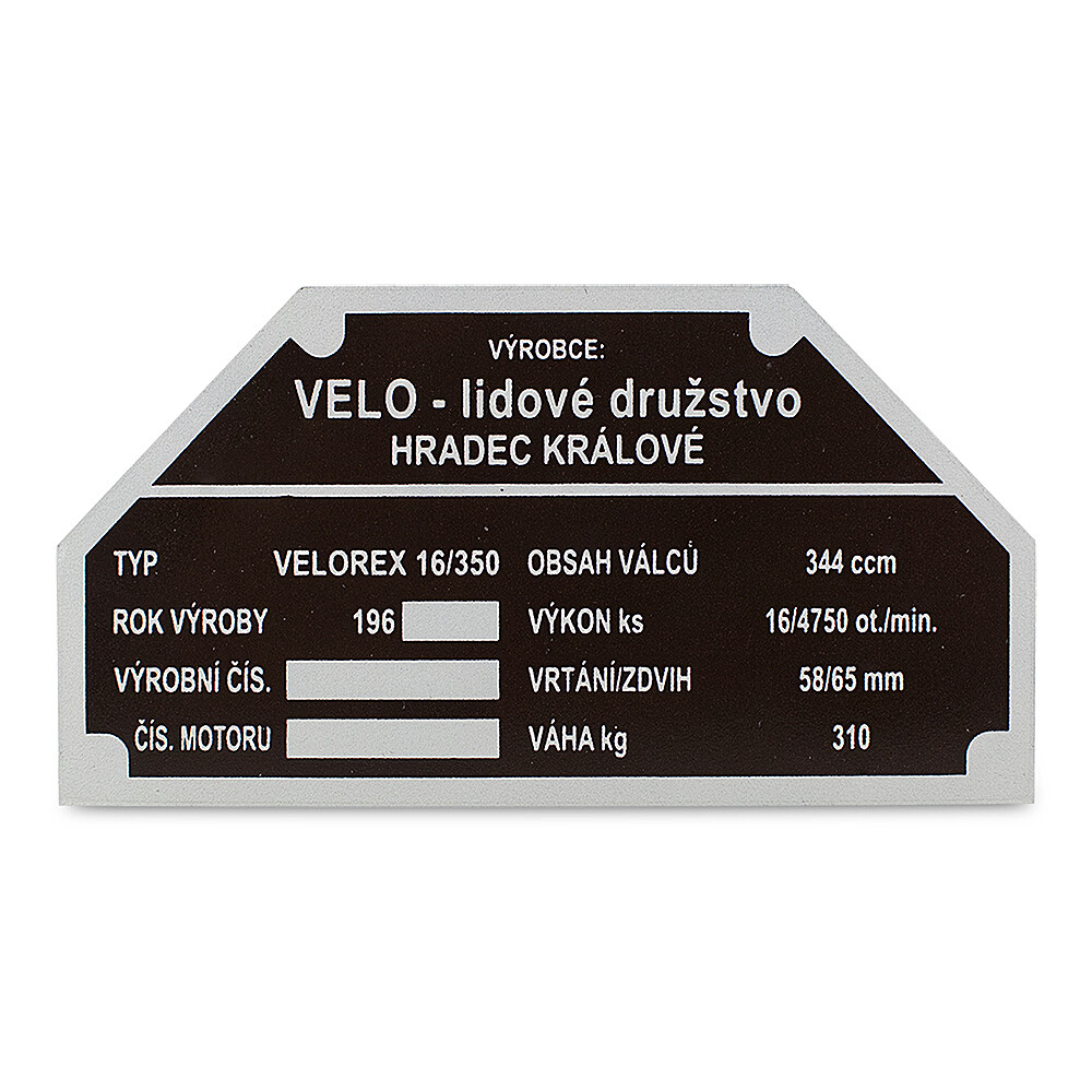 Drukowana aluminiowa etykieta na ramę pojazdu Velorex . Wydrukowany rok produkcji 196_ .