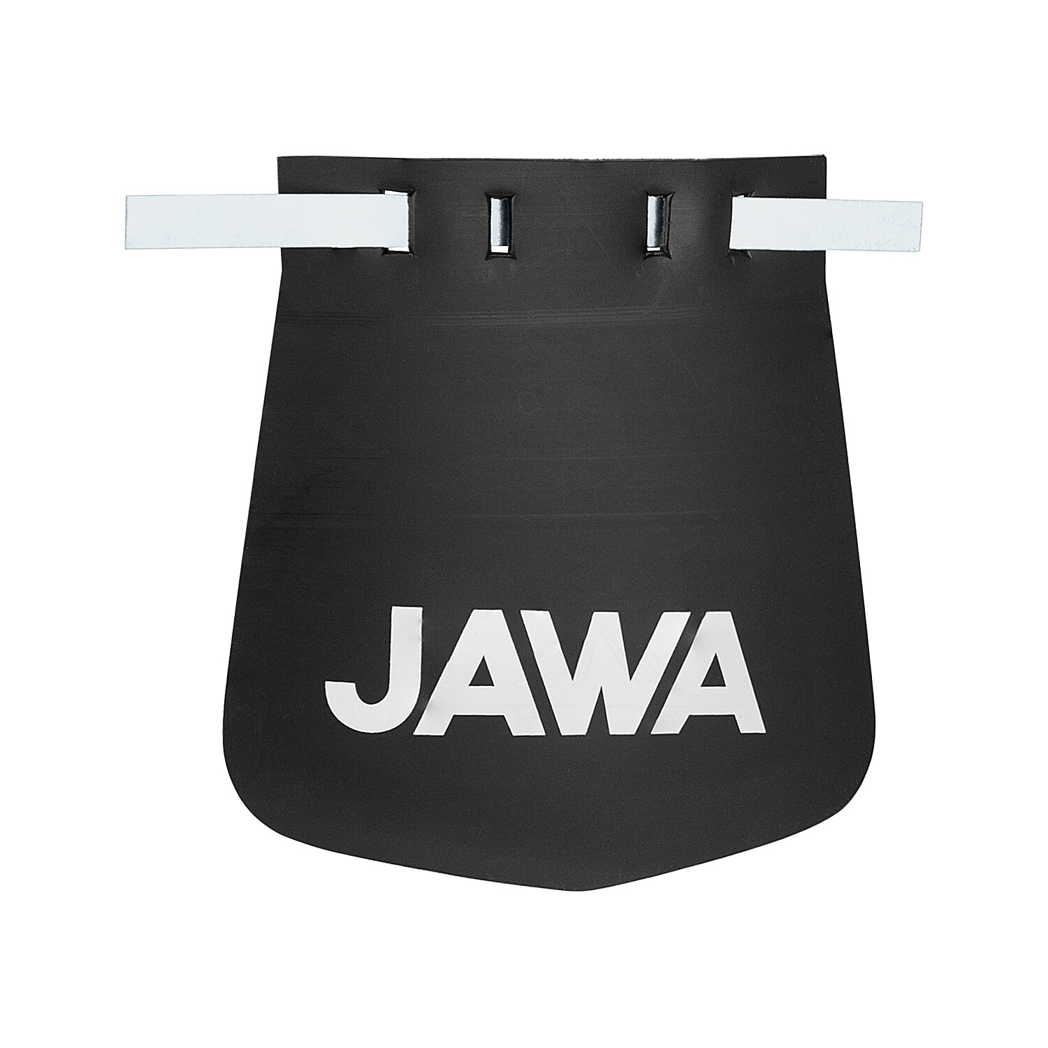 Fartuch z białym napisem JAWA, który służy do ochrony tyłu motocykla i silnika przed zachlapaniem.