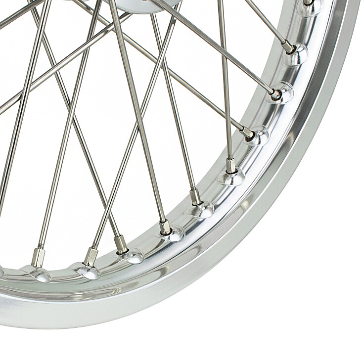 Kompletne koło przednie z aluminiową obręczą i szprychami ze stali nierdzewnej, przeznaczone do hamulców tarczowych w motocyklach Simson. Koło jest kompatybilne z zestawem hamulców tarczowych ( SIM24528135 ) montowanym w oryginalnym przednim widelcu teleskopowym lub w zestawie z nowoczesnym tłumieniem ( SIM65980243 ).