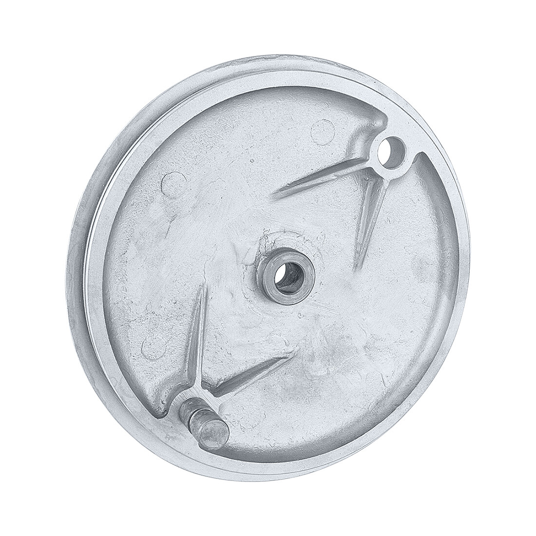 Replika osłony przedniego hamulca w surowym wydaniu. Po odlaniu, drobne niedoskonałości zostały ręcznie usunięte z osłony, a następnie powierzchnia została ujednolicona poprzez delikatne czyszczenie strumieniem wody.