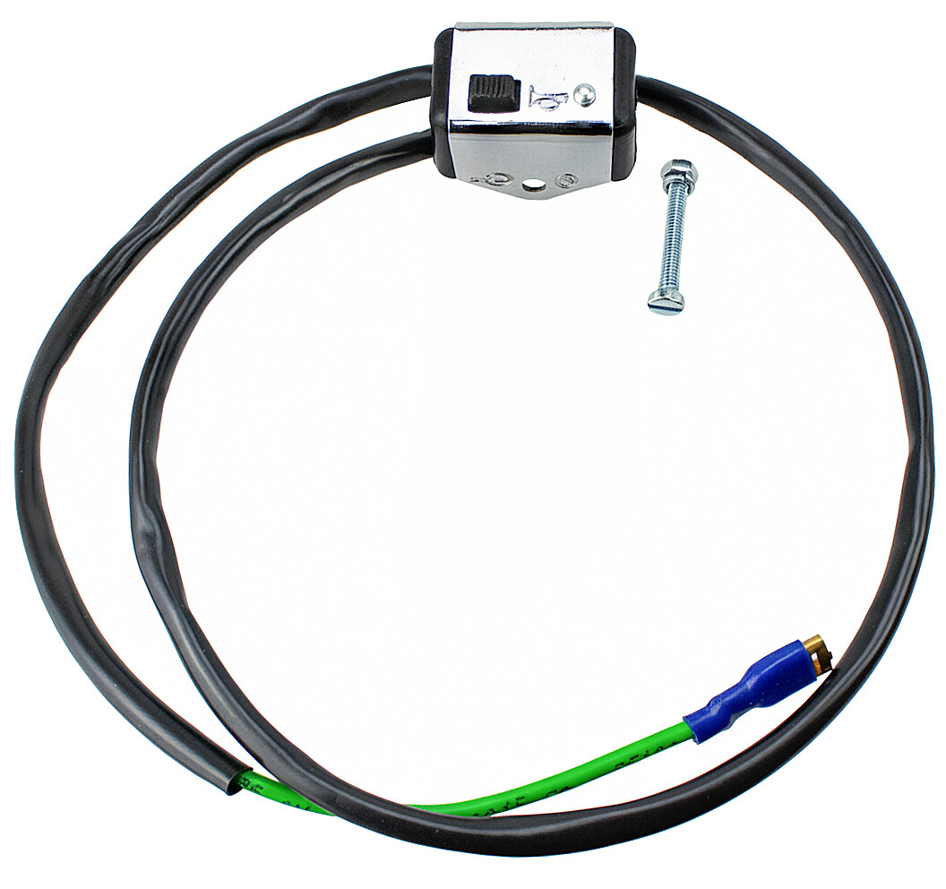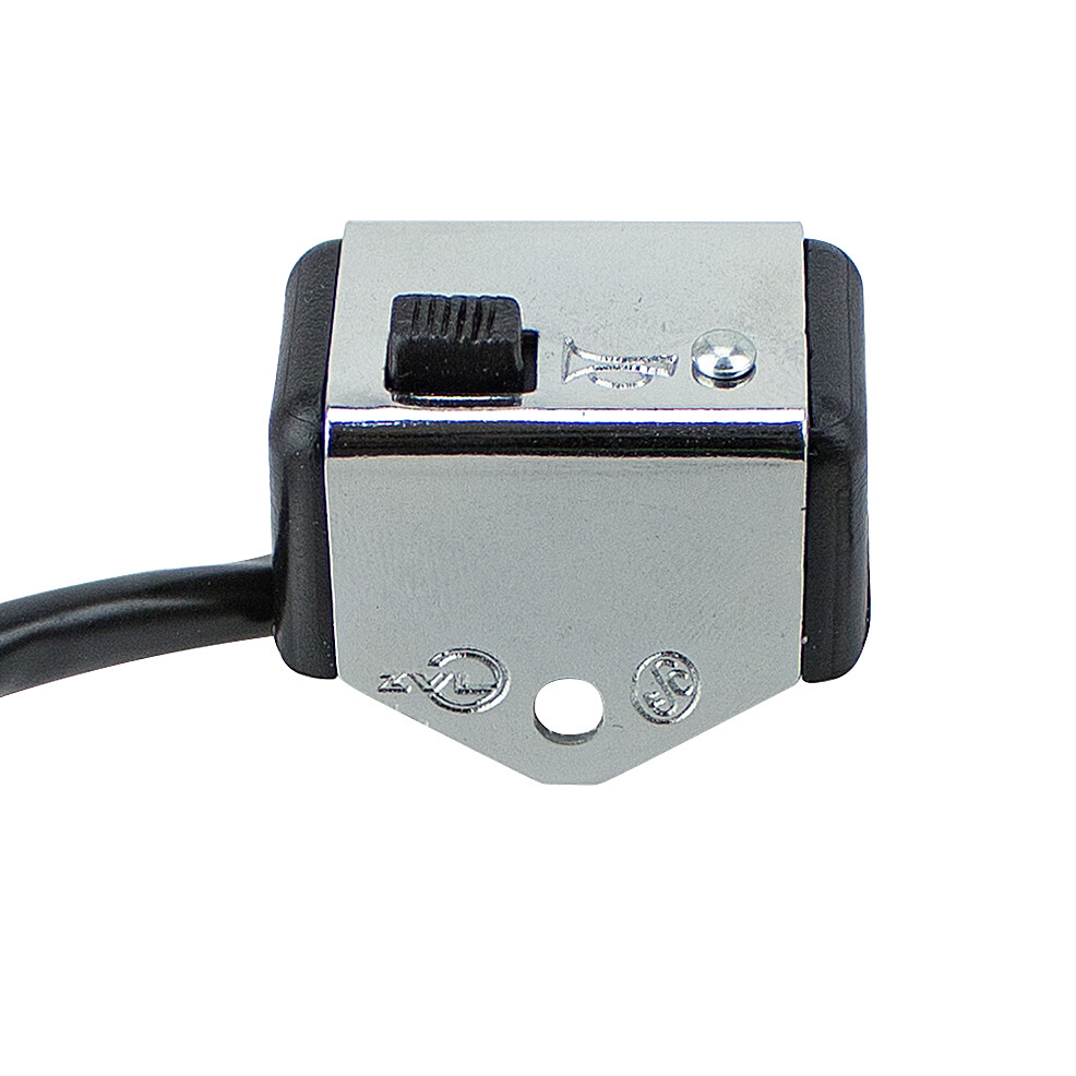 Kompletny zestaw przycisku brzęczyka (klakson) przeznaczony do montażu na kierownicy. Zestaw zawiera chromowaną obudowę, sam przycisk włącznika oraz okablowanie do podłączenia do instalacji elektrycznej motocykla. Jest to oryginalna konstrukcja zgodna ze specyfikacją fabryczną.