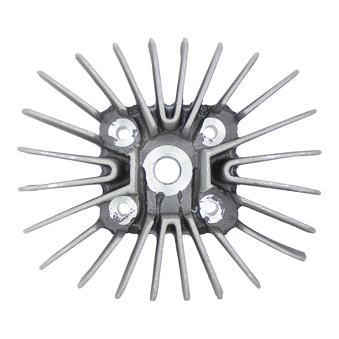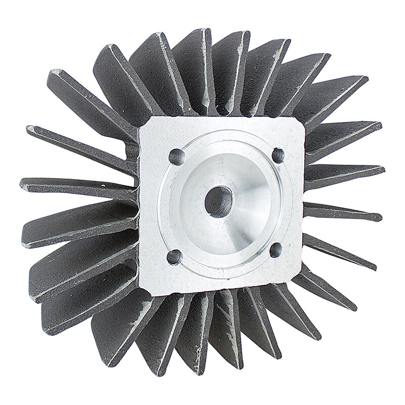 Tuningowa głowica cylindra z żebrami wentylatora, przeznaczona do silników Pionýr o średnicy cylindra 38 mm . Konstrukcja z rowkiem przeciwstukowym i centralnie umieszczoną świecą zapłonową maksymalizuje osiągi. Zaleca się stosowanie świec zapłonowych o długości gwintu 19 mm i odpowiedniej wartości opałowej (np. Brisk L15C lub NGK B7ES). Głowica jest odlewana w piasku, co zapewnia chropowatą strukturę powierzchni.