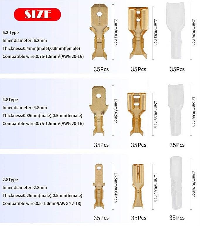 - 35 szt. złączy faston 4,8 mm (przekrój przewodu 0,75-1,5 mm2)